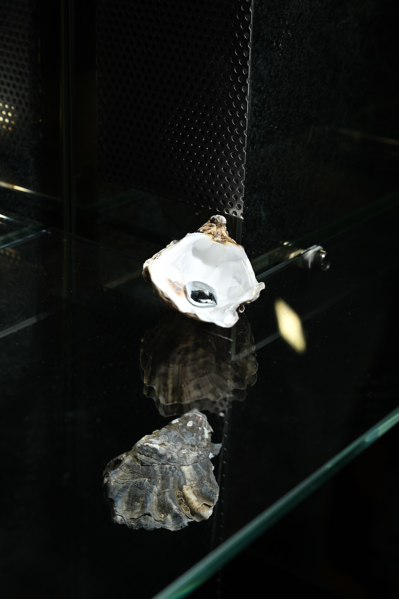 In the Oyster Alcove, Adrien Lagrange stages an encounter between fragility and transformation. His site-specific installation Venus in Leo brings oyster shells and gallium—a metal that liquefies just above room temperature—into slow interaction. The result is a sculptural act of surrender, where organic erosion meets technological instability and form yields to elemental logic.